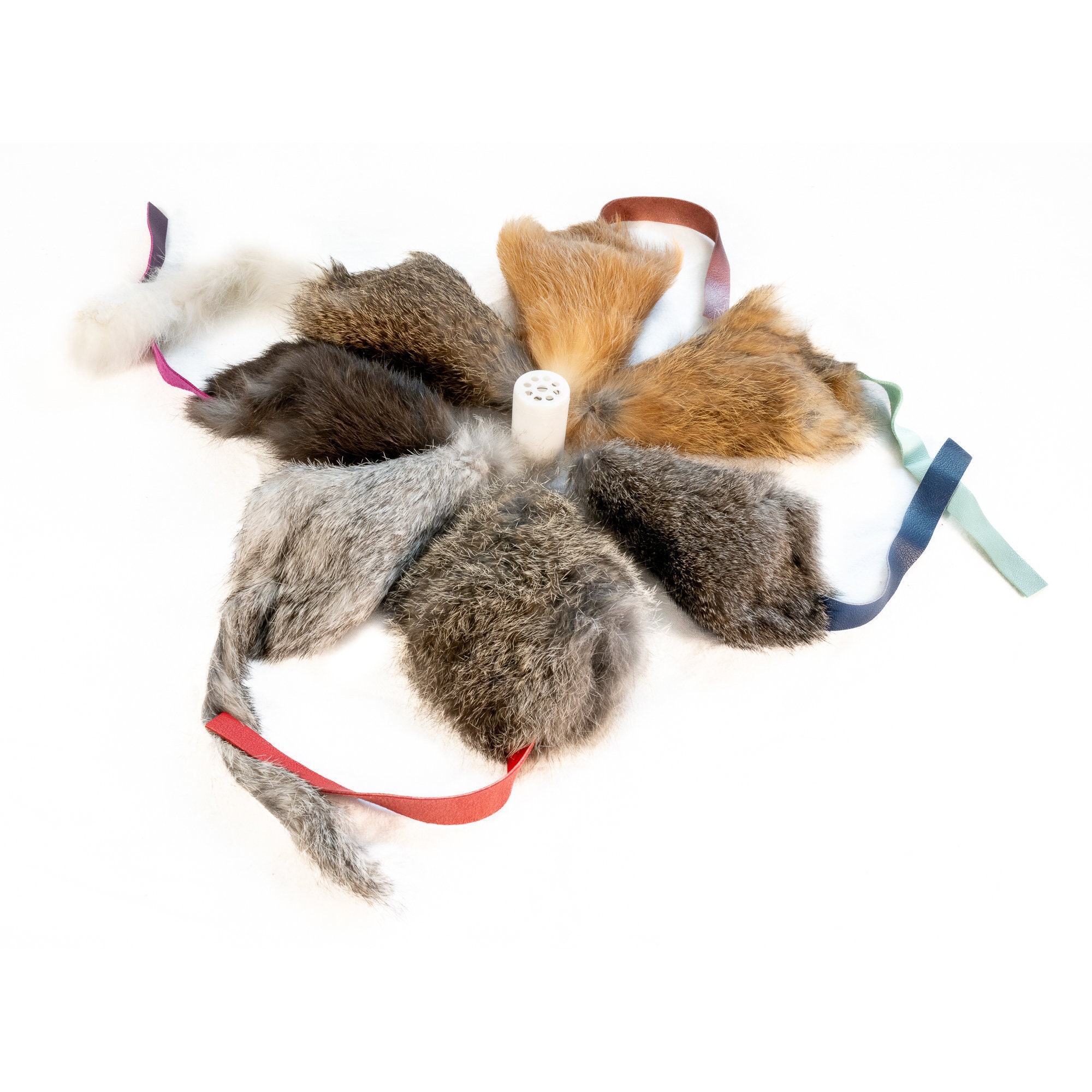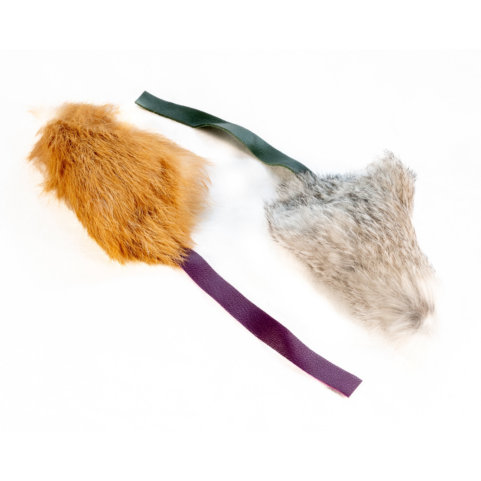 The Chirp Mouse is a handmade dog toy made from real rabbit fur and leather tail. The mouse contains a chirp column is also stuffed with rabbit fur rather than conventional plastic based stuffing only in the “face” before the chirp.